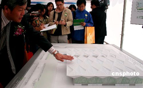 世博集團(tuán)董事長戴柳(左)在首次亮相的“世博會主題館模型”前介紹說,這一展館的建設(shè)成本將控制在十三億人民幣左右。