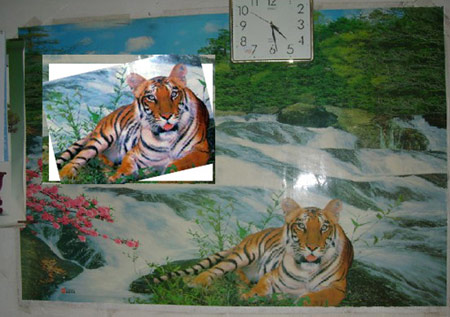 前晚9時(shí),網(wǎng)友“攀枝花xydz”在“打虎派”大本營色影無忌華南虎臨時(shí)論壇發(fā)帖說,“周老虎”的原形是一副老虎年畫,除耳朵不一樣外,哪里都一樣,甚至連老虎紋路都是一樣。各路高手將年畫老虎與“周老虎”進(jìn)行比對(duì),得出是同一只老虎的結(jié)論。