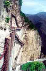 通天云衢:鐵索嶺上古建筑星羅棋布,山嶺巍峨,曠谷老松。綿綿黛色賞心悅目,但是從古至今鐵索嶺上下只有通過鐵索,很多老弱者不能成行,游人只能抱憾而去。為彌補(bǔ)此不足,三佳綿山投資開發(fā)者閻吉英先生于此山壁上建“之”字形天梯一座。天梯依山懸空縱橫盤亙而成,共計(jì)440多個(gè)臺階,全長300余米,如龍駕祥云,氣勢雄偉,堪稱精品。春日登此棧道,觀谷中山花競放,鶯轉(zhuǎn)鸝鳴,微風(fēng)拂過發(fā)鬢,寵辱皆忘,心曠神怡。夏日登此棧道,看對山松柏蒼翠,山巒如黛,常有彩虹從溝間騰起,雖有游人不同心情千種萬種,看此景,只會感到聳峰茂林充盈神心。秋日的綿綿薄霧如白絮飄飛,云隨風(fēng)飄,風(fēng)隨云轉(zhuǎn),姹紫嫣紅的山嶺,時(shí)顯時(shí)沒。冬日雪落棧道云衢,蒼蒼茫茫,山接天,天連山,“大雪壓青松,青松挺且直,”只覺若谷虛懷之外的自己頂天立地。雪霽,金光灑滿山嶺,湛藍(lán)的天,一覽無余,畫中的您,只能用詩來喻。無論何時(shí)行于此棧道上,塵勞頓無,飄然欲仙。