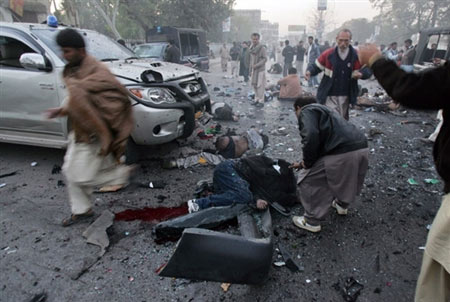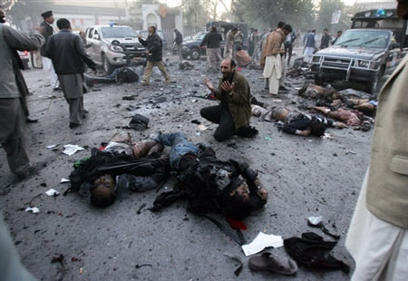 中新網(wǎng)12月27日電 據(jù)法新社報道,道巴基斯坦前總理貝-布托今日在競選集會上遭到炸彈襲擊,不治身亡。圖為爆炸現(xiàn)場。