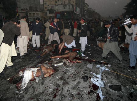 中新網(wǎng)12月27日電 據(jù)路透社報道,巴基斯坦前總理貝-布托今日在競選集會上遭到炸彈襲擊,不治身亡。圖為爆炸現(xiàn)場。(關(guān)新)