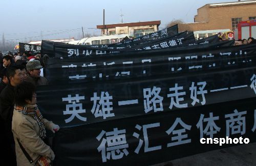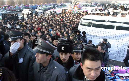 1月7日上午,烏魯木齊市燕兒窩殯儀館,萬余名烏魯木齊市民悼念在“1.2”火災(zāi)中犧牲的消防戰(zhàn)士朱曉雷、張宇、高峰3位烈士。朱曉雷、張宇、高峰的英雄事跡在社會(huì)上引起強(qiáng)烈反響,新疆各族群眾自發(fā)前往吊唁。自治區(qū)人民政府追授三位烈士為“模范消防衛(wèi)士”,公安部批準(zhǔn)他們?yōu)楦锩沂,自治區(qū)團(tuán)委追授三位烈士“新疆青年五四獎(jiǎng)?wù)隆保灾螀^(qū)公安廳授予三位烈士“優(yōu)秀共產(chǎn)黨員”榮譽(yù)稱號(hào)。中新社發(fā) 李雄心 攝