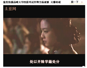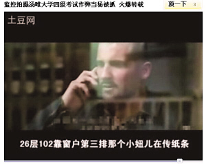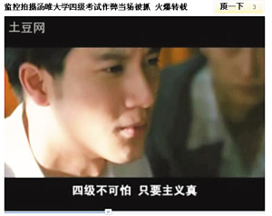 視頻的高潮出現(xiàn)在校方采取的反作弊行動(dòng),畫(huà)面切換成《無(wú)間道1》中黃秋生部署抓琛哥,臺(tái)詞卻換成:“這次四級(jí)考試,梁校長(zhǎng)下令狠抓作弊,所以我們采用高科技無(wú)線(xiàn)遠(yuǎn)程監(jiān)考,考試的時(shí)候,大家用望遠(yuǎn)鏡遠(yuǎn)距離瞅著考場(chǎng),一旦發(fā)現(xiàn)作弊的,立馬用手機(jī)報(bào)告抓捕大隊(duì),一個(gè)活口不留!辈⒓尤肼(lián)通廣告元素。接下來(lái),《越獄》里的林肯“奉命”拿著望遠(yuǎn)鏡報(bào)告:“26層102窗戶(hù)第三排那個(gè)小妞在傳紙條!薄缎略鷰熋谩防锏姆街蠸ir接獲報(bào)告后立馬拿著呼叫器大叫:“好,我們立馬去逮!弊詈,王佳芝和鄺裕民雙手被縛,跪在石礦場(chǎng)上,這時(shí)配上校方用無(wú)比嚴(yán)肅口吻說(shuō)出的“宣判詞”:“王佳芝等同學(xué)作弊,違背了天天學(xué)習(xí),好好向上的校訓(xùn),現(xiàn)處以開(kāi)除學(xué)籍處分!