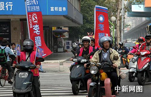 一月十日,一名“立委”候選人的選務團隊,將拉票彩旗插在摩托車上穿梭于臺北街頭造勢。 作者:孫自法