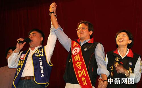 一月十日晚,臺北市市長郝龍斌(左)為“立委”候選人周守訓參選拉票造勢。 作者:孫自法