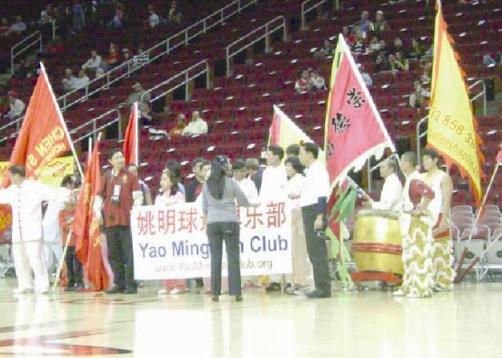 6)中國功夫走進火箭隊賽場,太極少林和秧歌為姚明助威----12月31日晚,NBA火箭隊舉行2007年最后一場比賽開始前,由休斯頓姚明球迷俱樂部等單位組織的中國功夫表演隊伍大張旗鼓地出現(xiàn)在豐田中心的賽場上,具有濃郁中華民族文化特色的太極、少林和秧歌到這里為火箭姚明助威來了。由黃曉明,程進才,釋行浩和喬鳳祥等率領的太極,少林和秧歌隊伍在豐田中心向美國主流社會大展中華文化之精粹。
