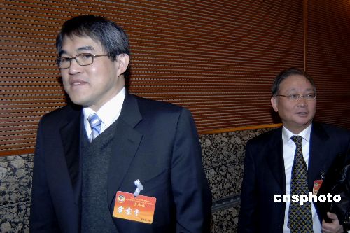 香港已故愛(ài)國(guó)人士霍英東三子霍震宇(左)作為新增補(bǔ)委員步入會(huì)場(chǎng)。