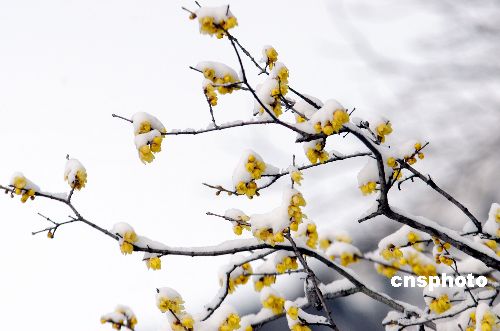 1月19日,安徽淮北相山公園內數(shù)株盛開的臘梅,在冰雪映襯下十分嬌艷。中新社發(fā) 泰峰 攝