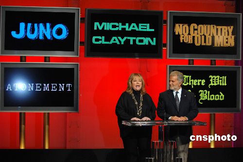 第八十屆奧斯卡金像獎(jiǎng)提名名單二十二日拂曉如期公布,《老無所依》(又譯《險(xiǎn)路勿近》)、《未血綢繆》(又譯《血色黑金》)、《邁克爾·克萊頓》、《朱諾》和《贖罪》入圍最佳影片。中新社發(fā) 張煒 攝