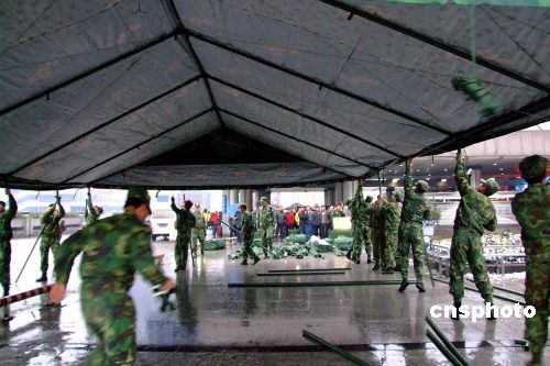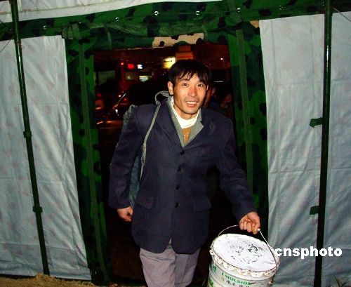 1月27日,南京軍區(qū)“硬骨頭六連”所在師接到杭州市政府請(qǐng)求支援電話,派出200余名工兵,火速趕往杭州火車站。官兵們寒著風(fēng)雪嚴(yán)寒,很快搭設(shè)好12頂野戰(zhàn)帳篷,并在帳篷里鋪設(shè)了草墊子,為滯留旅客提供休息之地。滯留在車站的民工旅客走進(jìn)野戰(zhàn)帳篷,臉上露出笑容,高興地說:今晚不會(huì)挨凍了,感謝黨和人民解放軍。據(jù)車站負(fù)責(zé)人介紹,因冰雪天氣影響,這天約有2萬名旅客滯留杭州火車站。中新社發(fā) 邱柏星 攝