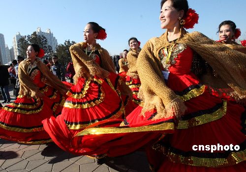 2月9日,在北京舉行的“2008北京朝陽國際風情節(jié)”上,來自英國、斯洛文尼亞、西班牙、美國、瑞典、俄羅斯、烏拉圭等10個國家的多支表演藝術(shù)團隊、180多位中外藝術(shù)家在多個舞臺進行不同場次的精彩表演。中新社發(fā) 錢興強 攝