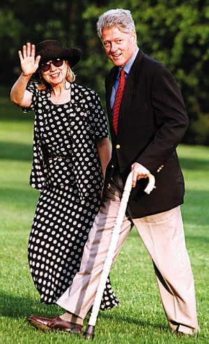 1997年,希拉里與克林頓出席一個(gè)公開場(chǎng)合,將圖案情意結(jié)發(fā)揮得淋漓盡致,黑底白波點(diǎn)連外套長(zhǎng)裙將她幻化成一張“人肉包裝紙”,她硬撐著說:“那套衣服不是這么糟,只是較為令人眼花而已。”