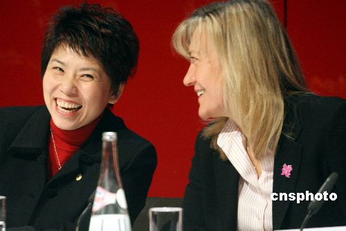 當(dāng)?shù)貢r間11日下午,北京奧組委奧運村部副部長鄧亞萍(左)和倫敦奧組委的官員、網(wǎng)球運動員出身的Debbie Jevans(右)在“婦女與奧運”論壇上交談。