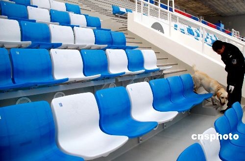 警察帶警犬檢查北京奧運(yùn)場館“水立方”座椅設(shè)施。