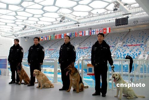 北京朝陽公安警犬隊(duì)民警準(zhǔn)備對(duì)奧運(yùn)場(chǎng)館“水立方”實(shí)施無遺漏防爆安全檢查。