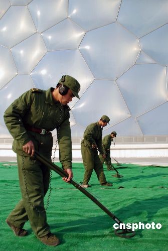 解放軍工兵正對(duì)北京奧運(yùn)場(chǎng)館“水立方”外圍實(shí)施防爆安全檢查。