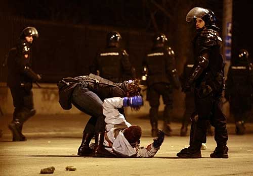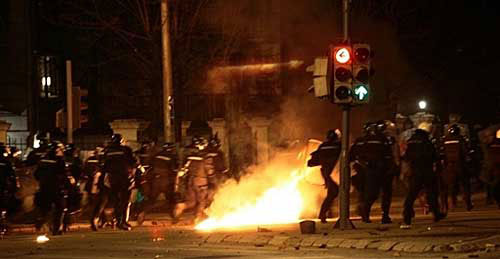 大約一千名憤怒的塞族青年,到美國大使館、一間美式快餐店和歐盟輪任主席國斯洛文尼亞大使館投擲石塊,并與防暴警察沖突,示威者又拆去歐盟旗幟,示威者又縱火、燒車,打爛大使館的玻璃窗。防暴警察以催激氣體及橡膠子彈驅(qū)散,又施放催淚氣體和出動警棍驅(qū)散。