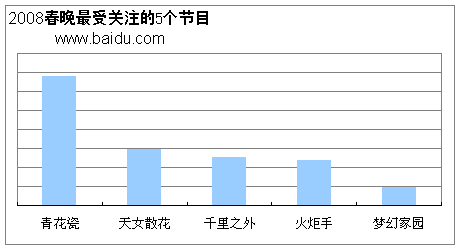 報(bào)告指出,在2008春晚節(jié)目中,周杰倫演唱的《青花瓷》是毫無(wú)疑問(wèn)的冠軍,而觀眾最為期待出彩的趙本山、宋丹丹小品《火炬手》讓人大跌眼鏡,春節(jié)期間網(wǎng)民的關(guān)注度僅僅排在第四位。而《天女散花》因章子怡的名氣而以微弱的優(yōu)勢(shì)擊敗了費(fèi)玉清的《千里之外》,贏得第二名。分析認(rèn)為,網(wǎng)民的喜好主要代表了年輕人的觀點(diǎn),作為年輕人的偶像,周杰倫、章子怡等明星出演的節(jié)目更受網(wǎng)民青睞。