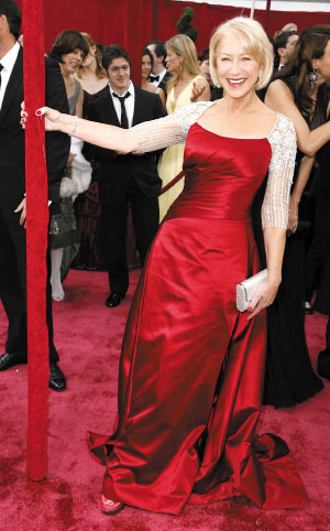 海倫·米倫 最成熟的紅色穿法。去年的奧斯卡影后海倫·米倫以一身“女王紅”亮相,米倫本人非常喜歡這條George Chakra長裙,“它有一種無形流露的力量感”,袖子部位則全部由施華洛世奇的水晶綴成。