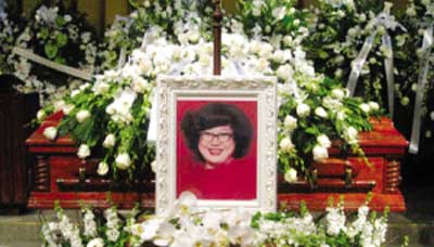 昨日的靈堂中央,擺放著肥肥的遺照和鮮花,遺照是她生前最喜歡的照片,鮮花也是她最愛的香檳色玫瑰為主,加上數(shù)百個悼念的花圈花籃,女兒鄭欣宜更是親手挑選了白色玫瑰和白色蝴蝶蘭組成的大花束放在肥肥的棺木上面。欣宜的發(fā)言因為情緒太過激動而不斷哽咽,她說:“這么多年來媽媽對我的照顧一直都無微不至,如今媽媽離開了,我真的很不舍得,不知道要怎樣面對以后的生活……”加拿大總理哈亳珀昨天也發(fā)出慰問信,表揚肥肥為加拿大社區(qū)的慈善事業(yè)做出很多貢獻。
