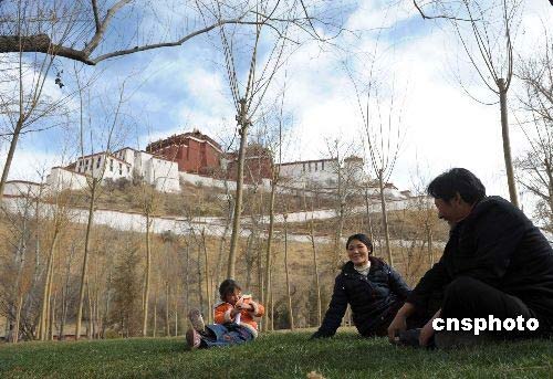 3月20日,拉薩市一個三口之家在布達拉宮下的宗角祿康內休閑娛樂。