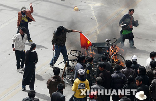 3月14日,一群不法分子在西藏自治區(qū)首府拉薩市區(qū)的主要路段實施打砸搶燒,焚燒過往車輛,追打過路群眾,沖擊商場、電信營業(yè)網(wǎng)點和政府機關(guān),給當(dāng)?shù)厝嗣袢罕娚敭a(chǎn)造成重大損失,使當(dāng)?shù)氐纳鐣刃蚴艿搅藝?yán)重破壞。事后查明,這天,不法分子縱火300余處,拉薩908戶商鋪、7所學(xué)校、120間民房、5座醫(yī)院受損,砸毀金融網(wǎng)點10個,至少20處建筑物被燒成廢墟,84輛汽車被毀。有18名無辜群眾被燒死或砍死,受傷群眾達382人,其中重傷58人。拉薩市直接財產(chǎn)損失達24468.789萬元。