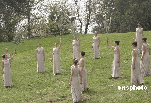 當(dāng)?shù)貢r間3月23日,北京奧運圣火采集最后一次彩排在希臘古奧林匹亞遺址舉行,女祭司手擎橄欖枝不斷變幻隊形,在山坡上舞蹈。中新社發(fā) 王歡 攝