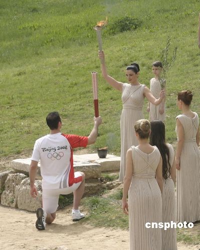 當(dāng)?shù)貢r間3月23日,北京奧運圣火采集最后一次彩排在希臘古奧林匹亞遺址舉行,最高女祭司瑪利亞·娜芙普利都與第一火炬手亞歷山大·尼克拉澤斯進行圣火交接。中新社發(fā) 王歡 攝