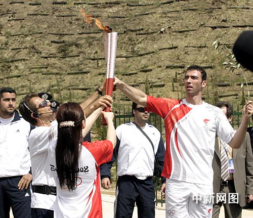 希臘當(dāng)?shù)貢r間3月24日,北京二00八年奧運會圣火采集儀式在古奧林匹亞競技場舉行,隨后火炬希臘傳遞開始。第一棒希臘運動員亞歷山大和第二棒中國的雅典奧運會冠軍羅雪娟對接火炬。 中新社記者 王歡