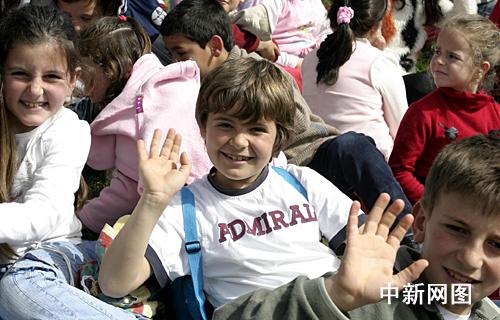 希臘當?shù)貢r間3月24日,北京二00八年奧運會圣火采集儀式在古奧林匹亞競技場舉行。希臘小觀眾坐在草坪上觀看采集儀式。 中新社記者 王歡