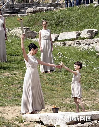 希臘當?shù)貢r間3月24日,北京二00八年奧運會圣火采集儀式在古奧林匹亞競技場舉行,最高女祭司接過男孩敬獻的橄欖枝。中新社記者 王歡