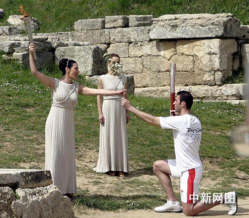 希臘當?shù)貢r間3月24日,北京二00八年奧運會圣火采集儀式在古奧林匹亞競技場舉行,最高女祭司將橄欖枝傳遞給第一火炬手希臘運動員亞歷山大,并用古希臘語對他說:“將圣火傳遞給世界,告訴人們奧運會就要開始了。 中新社記者 王歡