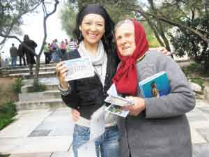 有收集明信片習慣的子怡與當?shù)刭u明信片的老婆婆合照。