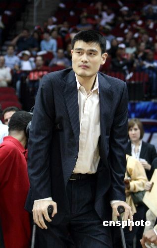 當?shù)貢r間3月26日晚,姚明手術后首次公開露面,觀看火箭隊友與森林狼隊的比賽;鸺97比86戰(zhàn)勝對手。中新社發(fā) 楊晉升 攝