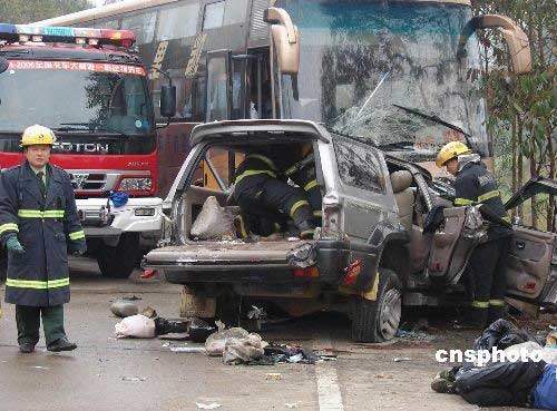 三月二十七日六點(diǎn)四十分,廣西柳州市鹿寨縣寨沙鎮(zhèn)發(fā)生特大交通事故,一輛從貴州開往廣東的小車與一輛大客車迎面相撞,造成小車上包括司機(jī)在內(nèi)的六男四女共十人當(dāng)場(chǎng)死亡,另外兩男子受重傷。中新社發(fā) 覃俊鋒 攝