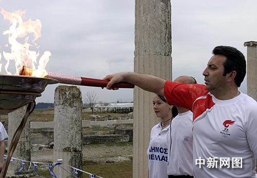 3月27日,北京奧運(yùn)圣火希臘境內(nèi)第四天傳遞,在派拉古城遺址舉行慶典儀式。該市最后一名火炬手、市長(zhǎng)察塔費(fèi)利蒂斯點(diǎn)燃了派拉遺址前的圣火盆。中新社記者 王歡