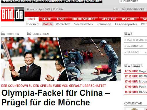 然而,CNN并不是唯一一家歪曲報(bào)道西藏事件的媒體,也不是最有“創(chuàng)意”的媒體!兜聡(guó)畫報(bào)》在最近的報(bào)道中所使用的圖片顯然比CNN更有“才”。《德國(guó)畫報(bào)》多次將尼泊爾警察在加德滿都驅(qū)散游行示威者的圖片進(jìn)行裁剪、拼接,然后配在談?wù)摫本⿰W運(yùn)的文章中,標(biāo)題竟用“西藏事件升級(jí),應(yīng)該抵制奧運(yùn)會(huì)嗎?”(人民網(wǎng)4月5日電)