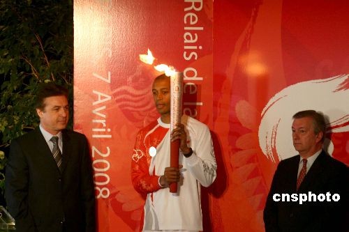 當(dāng)?shù)貢r間4月7日中午12時35分,北京奧運圣火在“浪漫之都”巴黎傳遞在巴黎的地標(biāo)埃菲爾鐵塔拉開帷幕。圖為第一個火炬手、法國田徑運動員史蒂芬·迪亞加納(中)在現(xiàn)場展示祥云火炬。中新社發(fā) 沈晨 攝