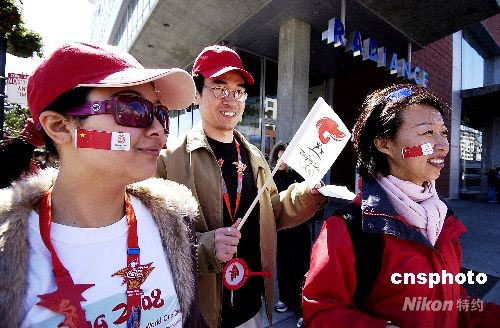 當?shù)貢r間四月九日,北京奧運火炬在美國舊金山傳遞。兩名華人女青年為支持北京奧運,將自制的中國國旗和北京奧運標志貼在臉上參加傳遞活動。陳鋼 攝