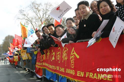 法國當(dāng)?shù)貢r間4月7日中午,北京奧運圣火在“浪漫之都”巴黎傳遞在巴黎的地標(biāo)埃菲爾鐵塔拉開帷幕。圖為法國巴黎當(dāng)?shù)厝A人華僑在埃菲爾鐵塔下迎接奧運圣火。 沈晨 攝