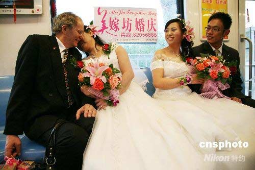 4月19日,新人們準(zhǔn)備乘坐南京地鐵“婚車專列”。當(dāng)日,南京舉辦“幸福長城2008”地鐵集體婚禮,12對新人在行進(jìn)中的南京地鐵“婚車專列”上喜結(jié)良緣,讓其他乘客一道共同感受甜蜜喜慶的氣氛,分享他們的幸福時(shí)光。中新社發(fā) 鐘山 攝