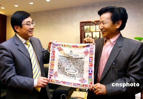 4月29日,美籍華人喬文安(右)在上海向中國(guó)2010年上海世博會(huì)組織者捐贈(zèng)具有百年歷史的國(guó)際博覽會(huì)絲綢紀(jì)念品等“世博會(huì)文物”,F(xiàn)場(chǎng)捐贈(zèng)的文物之一是“1909年美國(guó)西雅圖市舉辦的阿拉斯加—尤康—太平洋博覽會(huì)絲綢紀(jì)念品”(如圖)。專家鑒定具有百年歷史的這一絲綢紀(jì)念品上繪有當(dāng)時(shí)象征中國(guó)清政府的龍紋旌旗,是中國(guó)參與世界性博覽會(huì)的有力物證。自今年5月起,喬文安捐贈(zèng)的“世博會(huì)文物”將在上海新辟的“世博會(huì)常年展示中心”公開展示。中新社發(fā) 世博局 攝