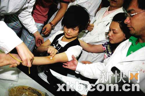 昨天記者向天娛求證,得到的回應(yīng)是李宇春確實(shí)在13日下午到北京市紅十字會(huì)血液中心為災(zāi)區(qū)人民獻(xiàn)了200毫升血,更透露李宇春因?yàn)闀炑,獻(xiàn)血時(shí)一直是把臉別過(guò)去的,不敢看針管。