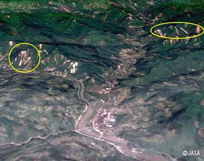 北京時(shí)間5月12日14:28,四川汶川發(fā)生里氏8級(jí)地震,日本宇宙航空研究開發(fā)機(jī)構(gòu)(JAXA)19日在其網(wǎng)站上刊登了利用陸地觀測(cè)技術(shù)衛(wèi)星(ALOS)觀測(cè)的數(shù)據(jù)圖。此次觀測(cè)的重點(diǎn)區(qū)域是北川縣,數(shù)據(jù)取得時(shí)間是北京時(shí)間5月18日11:49,通過(guò)圖樣對(duì)比,可以看出此次地震對(duì)北川縣的破壞情況。