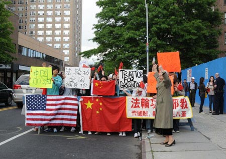 5月22日,位于美國紐約卡辛納大道和三福大道交界處的東南角,聚集著一群華人,而在他們對面,兩條大道交界處的西北角,則聚集著一群“法輪功”分子。一位白發(fā)老人高舉“只有共產(chǎn)黨才能救中國”的牌子,與“法輪功”的“天滅中共”的牌子形成鮮明的對照。