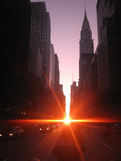 據(jù)悉,每年有兩天落日會(huì)對(duì)齊紐約曼哈頓主要的東西向街道,城市中高建筑會(huì)擋住落日,使曼哈頓看起來(lái)像是現(xiàn)代的巨石陣,整個(gè)紐約不夜城都沐浴在陽(yáng)光下。