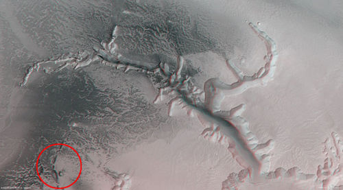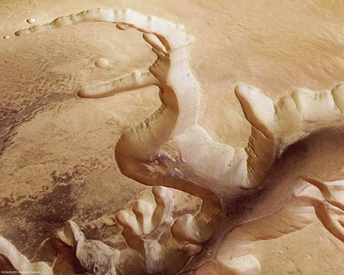 兩個沖擊坑直徑約8公里,位于巖脈東南方。東邊的沖擊坑已經(jīng)被部分侵蝕,成為峽谷,巖屑已被沖走。