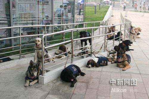 在主新聞中心門(mén)口等待排爆的警犬。攝影:宋方燦