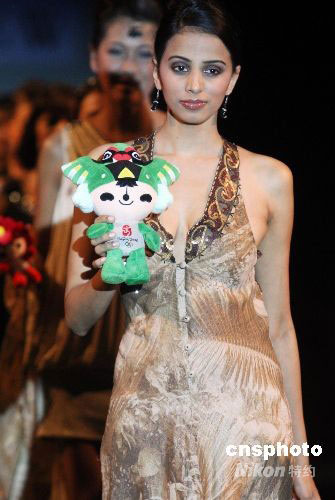 圖為模特手捧福娃展示劉薇最新時(shí)裝作品。