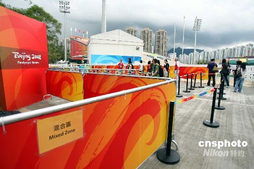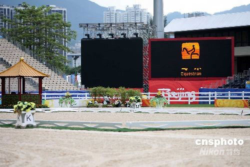 北京2008年殘奧馬術(shù)比賽將在九月七日至十一日在香港舉行。在五天的比賽中,將有七十三名運(yùn)動員參賽,殘奧馬術(shù)選手村和比賽場地基本沿用奧運(yùn)馬術(shù)的措施,但為了保障運(yùn)動員們的安全,部分場館則做出適當(dāng)改動。中新社發(fā) 洪少葵 攝